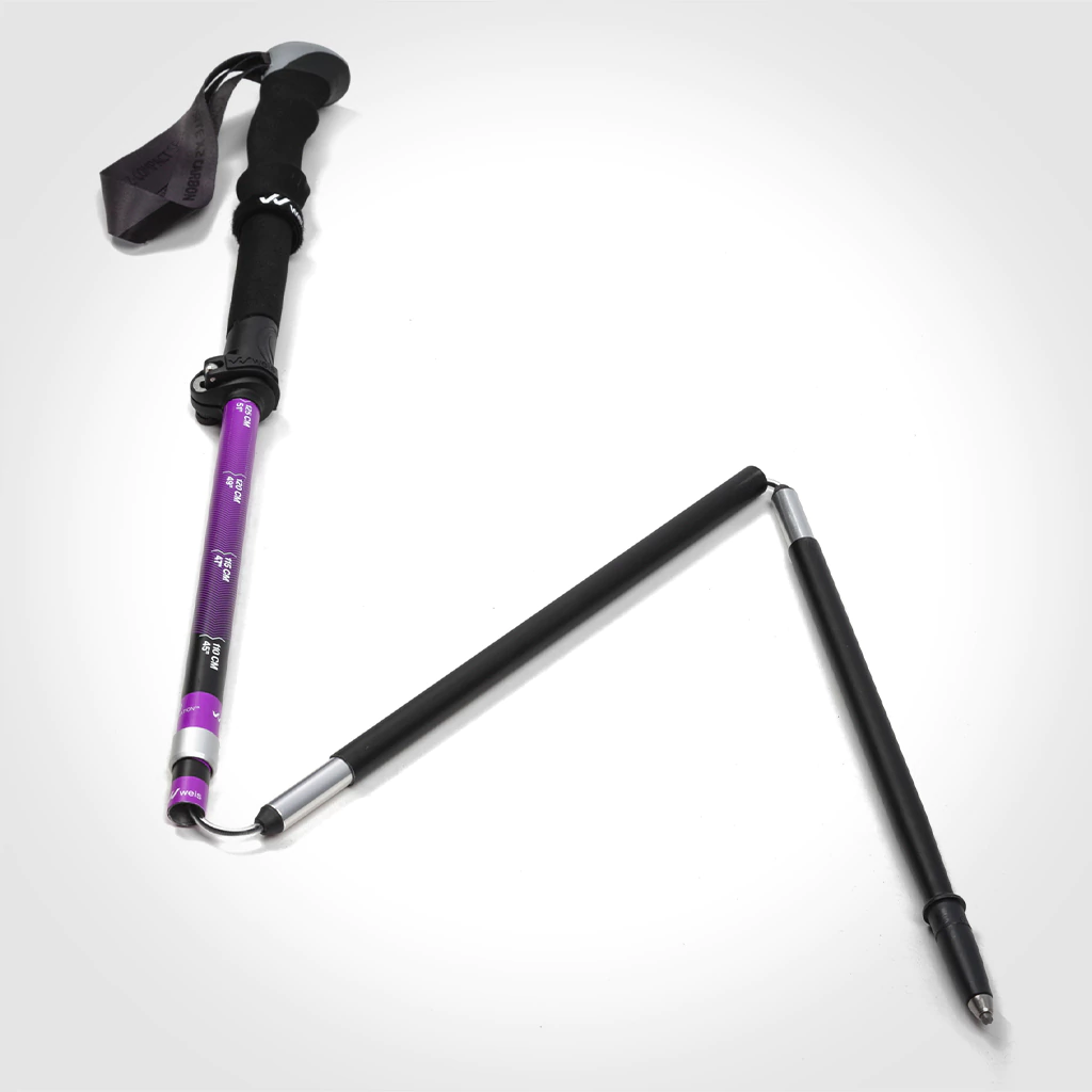 Presioná el botón y deslizá la empuñadura hacia la punta del bastón. Separá los tramos agarrándolos cerca de la junta y tirando de ellos en direcciones opuestas. Luego plegá los bastones en forma de una “Z” compacta.