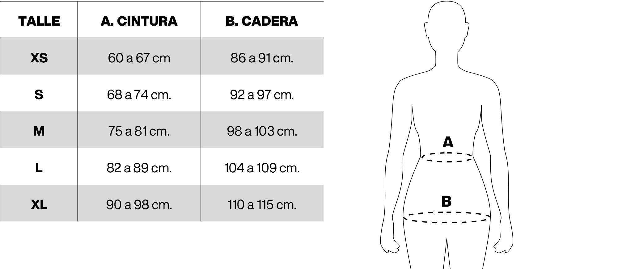 Medí el contorno de tu cintura y la más ancha de tu cadera y buscá la correlación con el talle de las calzas.
