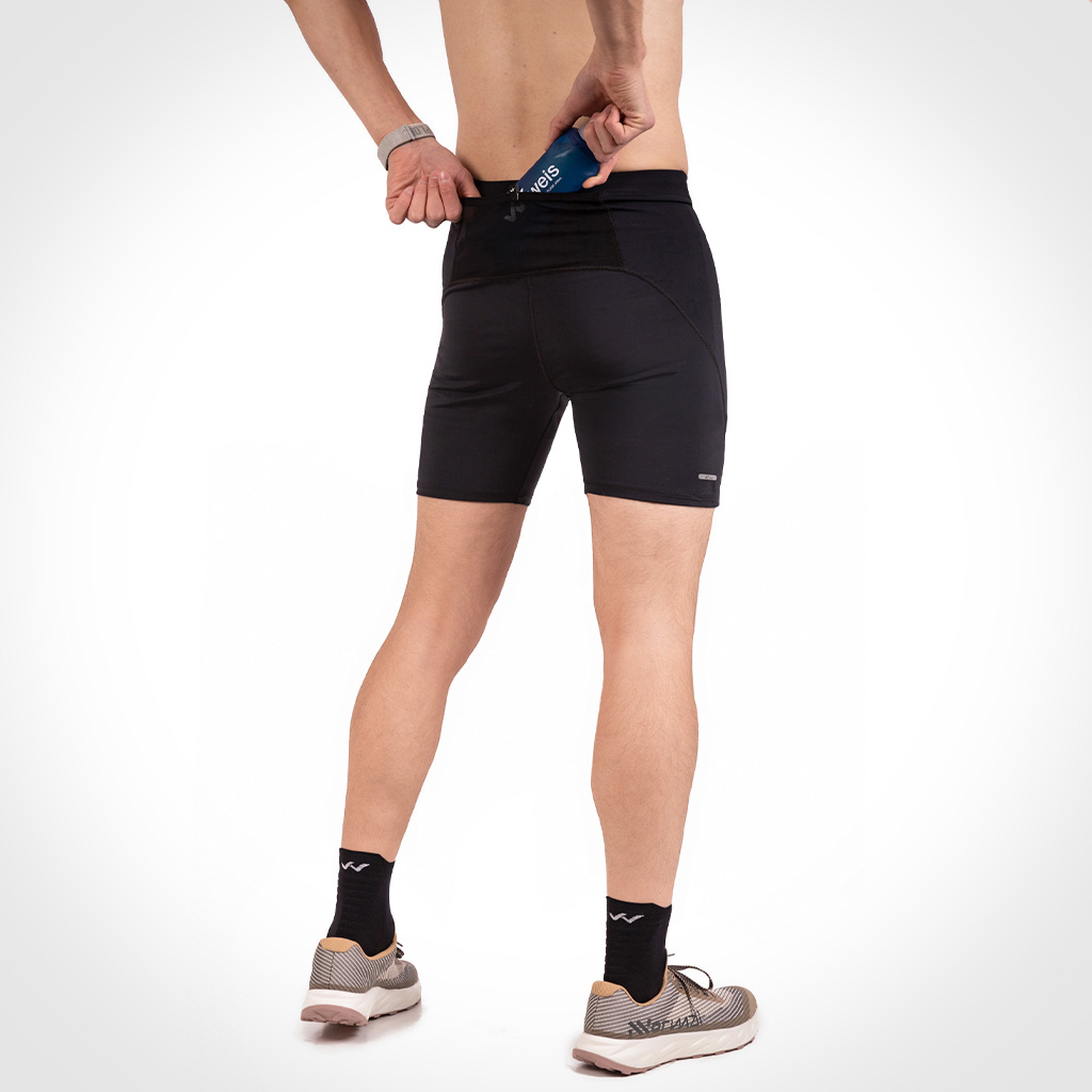 La calza LEIRON cuenta con un bolsillo trasero con capacidad para celular, un soft flask o un rompeviento liviano. Este almacenamiento es seguro y estable, garantizando que no haya rebotes ni pandeos en carrera.