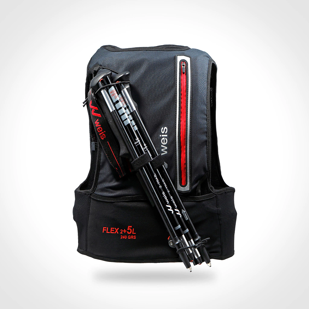 El chaleco de hidratación expandible FLEX 2+5 L incluye portabastones*, un sector diferenciado para bolsa de hidratación, una funda isotérmica impermeable y 8 bolsillos, todo al alcance de la mano.
