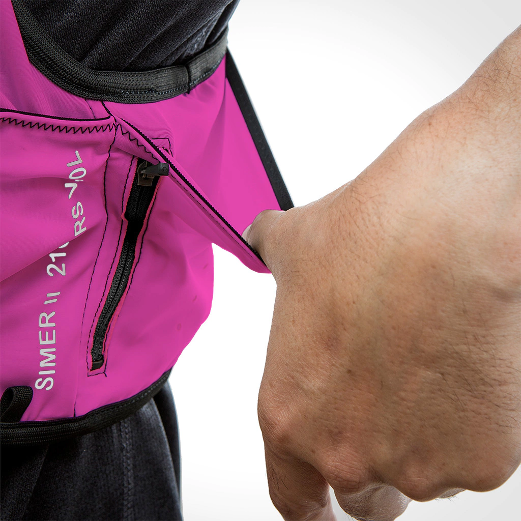 El chaleco de hidratación expandible SIMER II 10 L mantiene todos los bolsillos y compartimentos del SIMER 7 L y amplía su compartimento principal en 3 litros extras de guardado, todo al alcance de la mano.